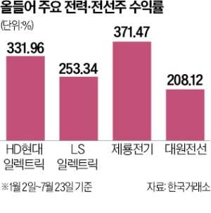 올 들어 이날까지 유가증권시장에서 가장 수익률이 높은 종목 상위 세 개는 모두 전력 인프라 관련 기업이다. HD현대일렉트릭의 주가 상승률이 331.96%로 가장 높다. LS일렉트릭은 253.34%, 전선 제조·판매 기업 대원전선은 208.12% 뛰어 뒤를 이었다. 코스닥 상장사인 제룡전기는 올 들어 상승률이 371.47%에 달한다.