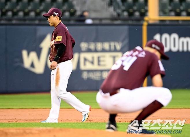 23일 잠실야구장에서 열린 키움과 두산의 경기, 2회말 1사 1,2루 키움 유격수 김태진이 두산 전민재의 타구를 수비하다 부상을 당해 교체되고 있다. 잠실=허상욱 기자 wook@sportschosun.com/2024.07.23/