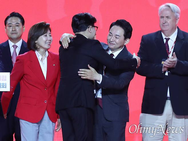 | ▲ 한동훈과 인사하는 원희룡-나경원 한동훈 국민의힘 신임 당대표가 23일 오후 경기 고양시 킨텍스에서 열린 국민의힘 제4차 전당대회에서 경쟁했던 원희룡 후보와 포옹하고 있다. |