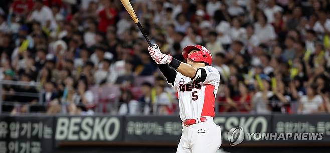 (광주=연합뉴스) 조남수 기자 = 23일 광주기아챔피언스필드에서 열린 프로야구 NC 다이노스와 KIA 타이거즈의 경기. KIA 김도영이 6회말 1사 1루에서 좌측 담장을 투런홈런을 때리고 있다. 김도영은 이 홈런으로 단타-2루타-3루타-홈런을 순차적으로 때리는 내추럴 사이클링 히트를 기록했다. 2024.7.23