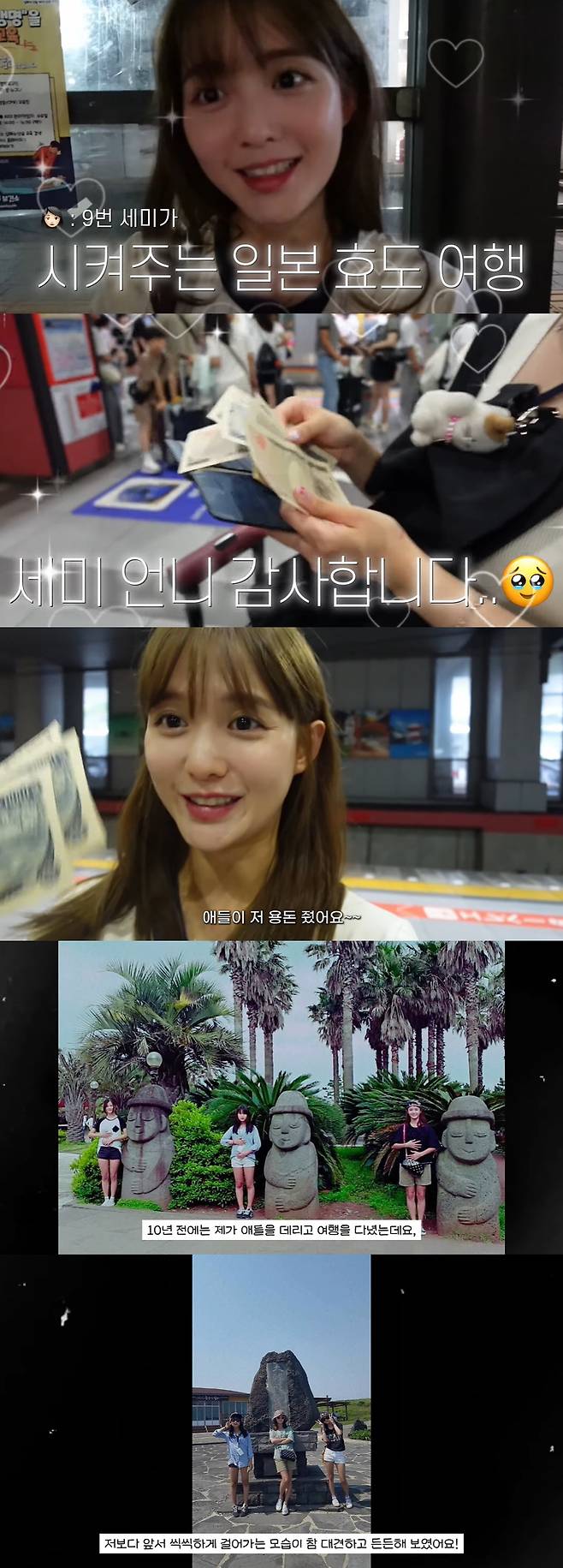 남보라는 공항버스를 타기 전 "오늘 효도 여행을 떠난다. 세미가 일본 효도 여행을 시켜준다고 해서 지갑을 놓고 왔고 환전도 안 했다. 비행기 티켓, 숙소비도 세미가 내줬다"라며 두 동생 옆에서 흐뭇한 미소를 지었다.