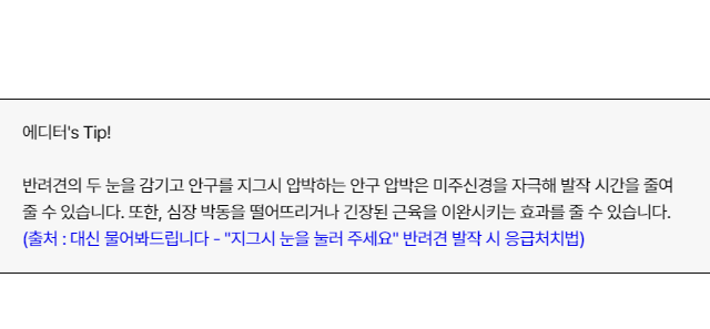 만약 부분 경련이 전신 발작으로 이어진다면 양 눈을 감긴 후에 눈두덩을 지그시 눌러주는 안구 압박으로 응급 처치를 해주셔야 합니다. 이후 목을 받쳐주셔서 반려견이 숨을 쉴 수 있게 유지한 상태로 빨리 동물 병원에 내원해야 합니다.