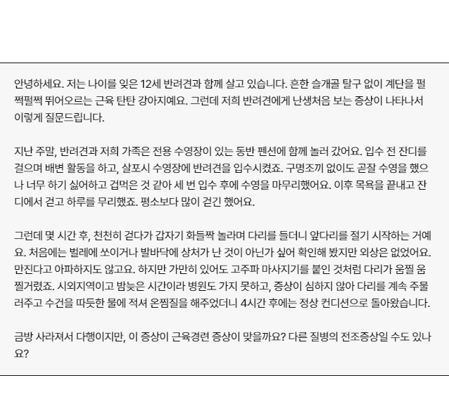 이상 증세를 보이면 바로 동물 병원에서 수의사의 확인을 받는 것이 좋으나, 사연의 주인공처럼 빠른 방문이 어려운 상황도 있습니다. 해당 증상이 또 발현되고, 발작이 아닌 근육·관절 통증으로 보인다면 증상이 나타나는 부위를 가볍게 마사지해 주세요. 증상이 나타나는 발을 위쪽으로 올려서 편안하게 해주는 것도 도움이 됩니다.