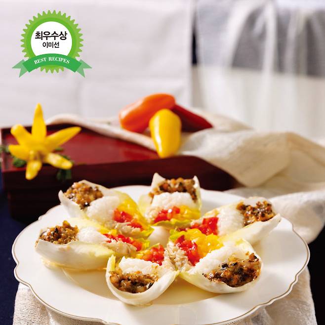6 엔다이브 위에 ⑤의 밥을 펼치고 ④, 파프리카 순으로 올려 완성한다.