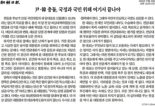 조선 = 尹·韓 충돌, 국정과 국민 위해 여기서 끝나야