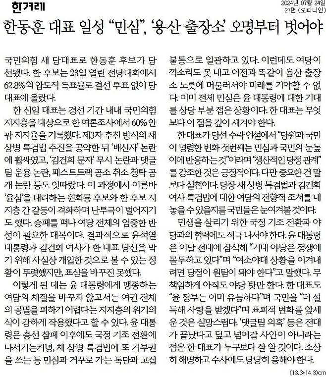 한겨레 = 한동훈 대표 일성 “"민심”, ‘용산 출장소’ 오명부터 벗어야