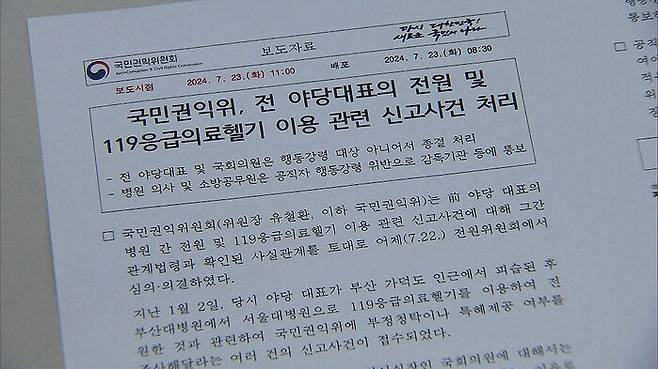 이렇게 의료진들과 소방 공무원은 여러 강령 위반 사실이 확인되면서 '특혜 제공자'로 각 소속기관에 통보되는 것으로 결론이 났습니다. 문제는 그 다음입니다. 특혜를 제공받은 쪽인 이 전 대표와 직접 헬기 전원을 요청한 것으로 알려진 당시 비서실장 천준호 민주당 의원에 대한 권익위의 처분은 '종결'로 처리한 겁니다.