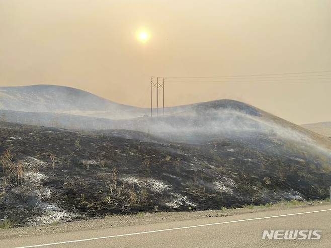 [헌팅턴=AP/뉴시스] 23일(현지시각) 미 오리건주 헌팅턴 인근 84번 주간 고속도로 주변이 산불 '더키 파이어'로 타버려 연기가 피어오르고 있다. 2024.07.24.