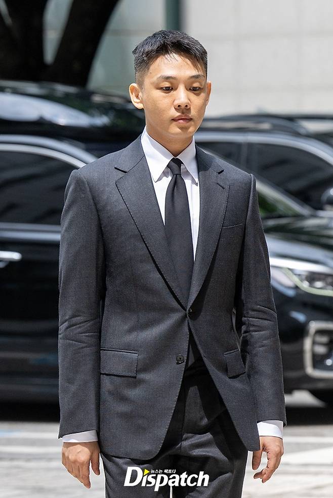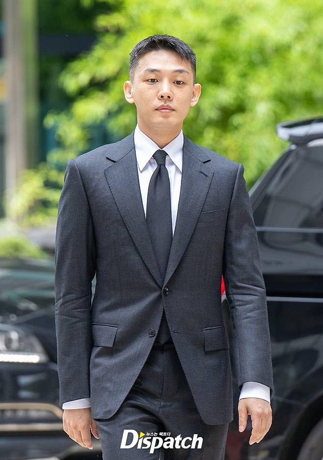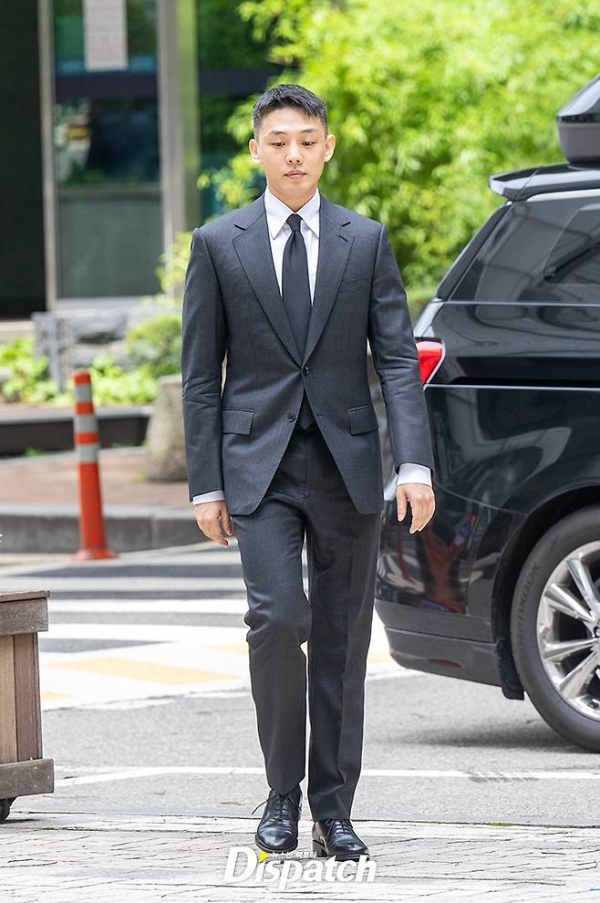 유아인은 그레이 컬러 수트를 입고 차분한 표정으로 법원에 들어섰다.