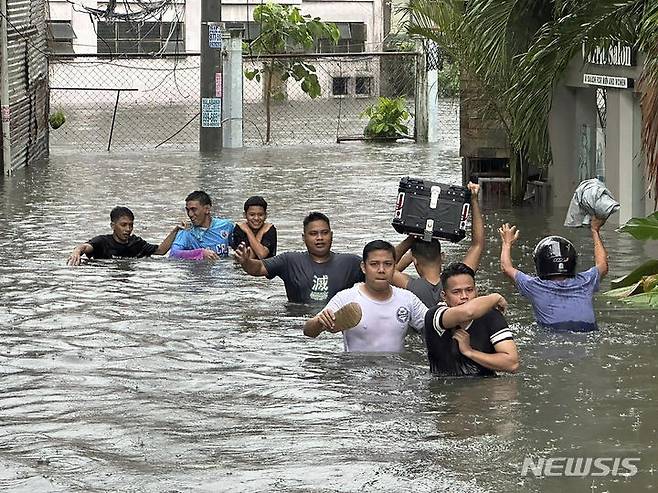 [마닐라=AP/뉴시스] 24일(현지시각) 필리핀 마닐라에서 주민들이 제3호 태풍 '개미'의 영향으로 침수된 거리를 헤쳐 나가고 있다. '개미'가 23일 필리핀 동쪽 해상 약 600㎞ 부근을 지나면서 마닐라가 물에 잠기는 등 피해가 잇따랐다. 대만에 상륙한 '개미'는 25일 중국 푸젠성과 저장성에 상륙할 것으로 예상된다. 2024.07.24.
