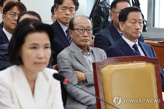 (서울=연합뉴스) 김주성 기자 = 24일 오후 국회 과학기술정보방송통신위원회에서 열린 이진숙 방송통신위원장 후보자에 대한 인사청문회에서 류희림 방송통신심의위원장(맨 오른쪽), 김재철 전 MBC 사장(오른쪽에서 두번째) 등 증인들이 발언을 듣고 있다. 2024.7.24