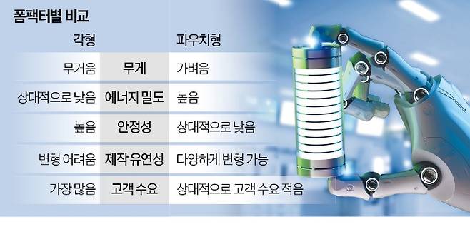 네모난 육면체(삼성SDI) vs 봉투 형태(LG에너지솔루션·SK).