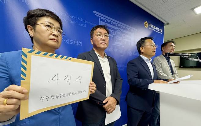 | ▲ 더불어민주당 소속 제주도의회 의원들이 24일 제주도의회 기자실에서 기자회견을 열고 민주평화통일자문회의 사무처장에 태영호 전 의원을 임명한 데 대해 반발하며 자문위원 직을 사퇴하겠다고 밝히고 있다. |
