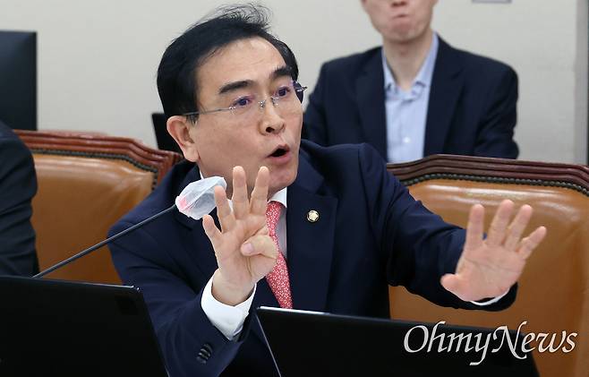 | ▲ 태영호 국민의힘 의원(서울 강남구갑)이 2023년 10월 11일 오전 서울 여의도 국회에서 열린 외교통일위원회의 통일부, 민주평화통일자문회의사무처 등에 대한 국정감사에서 9.19 군사합의 관련해 김영호 통일부 장관에게 질의하고 있다. |