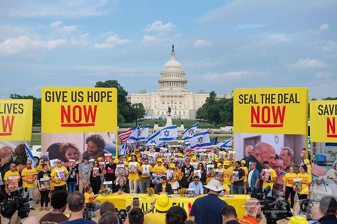 (워싱턴 AFP=뉴스1) 정지윤기자 = 이스라엘 인질 가족과 지지자들이 23일 워싱턴 국회의사당이 바라보이는 내셔널몰에서 베냐민 네타냐후 이스라엘 총리에게 하마스와 즉각 평화협정을 맺을 것을 촉구하는 시위를 벌이고 있다. 네타냐후 총리는 다음날인 24일 미 상하 합동회의에서 연설을 할 예정이다. 2024.07.24