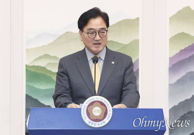 | ▲ 우원식 국회의장이 24일 오후 국회에서 기자회견을 열고 방송4법(방송법·방송문화진흥회법·한국교육방송공사법·방송통신위원회설치법 개정안) 본회의 상정 방침을 밝히고 있다. |
