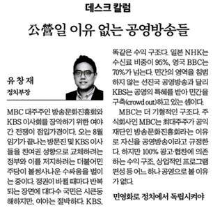 <한국경제> '데스크 칼럼/공영일 이유 없는 공영방송들'(7월 1일 유창재 정치부장)에서 유창재 정치부장은 "따지고 보면 우리나라 공영방송이 공영(公營)이어야 할 이유는 '주인이 없어야 정치권력이 방송을 장악할 수 있다'는 것 외에 달리 설명할 길이 없다"는 주장을 내세웠는데요. 유창재 부장은 공영방송 존재 이유로 ▲ 양질의 콘텐츠 제작 ▲ 보편적 시청권 제공 등을 언급하며 현재 공영방송은 민영방송과 같은 드라마·예능 프로그램을 만들어 경쟁하고, 국민 대다수는 유료방송 플랫폼으로 방송을 보기 때문에 제 기능을 하지 못한다고 진단했습니다. 유 부장은 현재 공영방송은 "차라리 '언론노조'가 주인인 방송이라고 하면 솔직하다는 평"이라도 했겠다며 "사실상 민영방송인 채널을 시장에 돌려주는 것이 방송을 정치에서 독립시키고 공정 경쟁을 통해 방송산업을 발전시킬 수 있는 유일한 해법"이라고 주장했습니다.