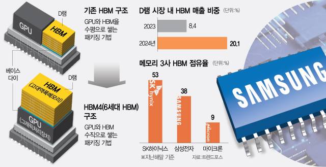 6세대 HBM4는 기본 구조부터 전 세대와 다른 최첨단 칩이다. 전 세대 HBM은 GPU 주변에 수평으로 HBM을 배열해 연산을 도왔지만 HBM4부터는 GPU 위에 HBM을 수직으로 쌓아 연산 속도를 높인다. 이때 GPU와 HBM 사이를 연결하면서 일종의 두뇌 역할을 하는 부품이 로직다이(베이스다이)다. 자체 파운드리(반도체 위탁 생산) 팹을 갖춘 삼성은 로직다이를 자체 생산할 수 있어 TSMC에 생산을 맡겨야 하는 SK하이닉스 등 경쟁자보다 훨씬 유리한 위치에 설 수 있다는 게 삼성 측 설명이다. 삼성이 약하다고 평가받았던 D램 본딩(접착) 공정에서도 6세대부터는 삼성이 상당한 경쟁력을 확보할 수 있다는 평가가 함께 나온다.