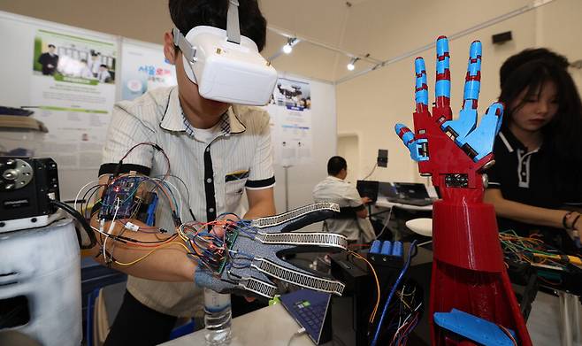 라떼는 말이야, 학교에서 트랜지스터 라디오를 만들었어. 그런데 말이야, 요즘 친구들은 로봇을 만들더군! 서울로봇고 학생들이 지난 17일 서울 동대문디자인플라자(DDP)에서 열린 2024 서울진로직업박람회에서 선보인 ‘동작 기억 로봇 의수’인데 문과생이었던 나로서는 꽤 놀랍더라고. ‘고교생이 로봇을 만든다고?’ 30여년 뒤 이 친구들이 ‘라떼는 말이야’라며 로봇 만든 이야기를 할 때 학생들은 무엇을 만들고 있을까?