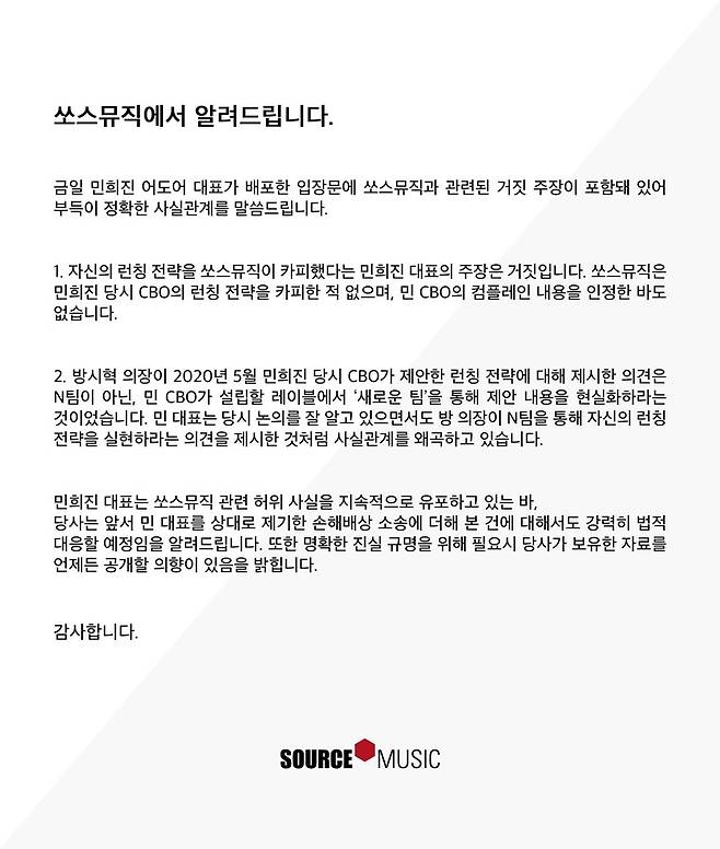 이어 쏘스뮤직은 "앞서 민 대표를 상대로 제기한 손해배상 소송에 더해 본 건에 대해서도 강력히 법적 대응할 예정"이라며 "명확한 진실 규명을 위해 필요시 당사가 보유한 자료를 언제든 공개할 의향이 있음을 밝힌다"고 덧붙였다.