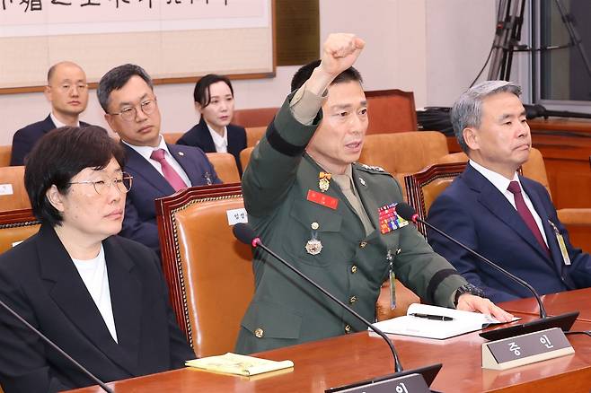 | ▲ 19일 국회 법제사법위원회에서 열린 '윤석열 대통령 탄핵소추안 발의 요청' 국민동의 청원 청문회. 임성근 전 해병대 1사단장이 손을 들고 발언 요청하고 있다. 2024.7.19 |