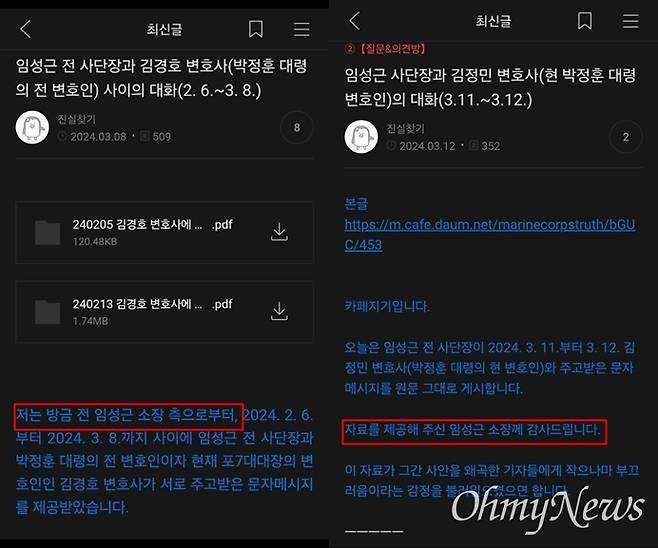 <오마이뉴스>가 24일 확보한 '채상병사건원인규명카페' 게시글에 따르면, 지난 3월 11~12일 카페 개설자이자 운영자인 '진실찾기'는 임 전 사단장이 김정민·김경호 변호사와 나눈 문자메시지를 게시하며 "자료를 제공해 주신 임성근 소장께 감사드린다"라고 적었다.