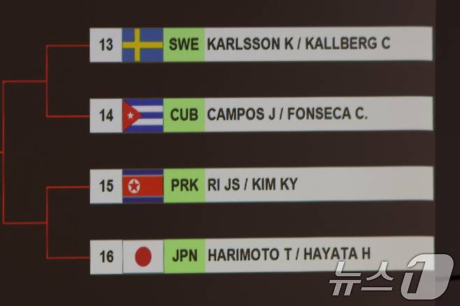 (파리(프랑스)=뉴스1) 박정호 기자 = 25일 오전(한국시간) 프랑스 파리 사우스 파리 아레나4 기자회견장에서 열린 탁구 복식 대진추첨식에서 북한과 일본의 대진이 완성되고 있다. 2024.7.25/뉴스1