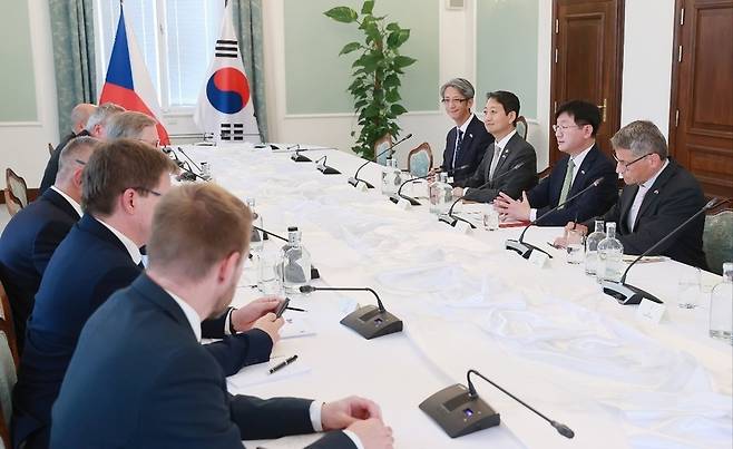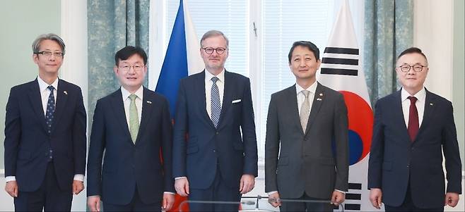윤석열 대통령이 체코 신규 원전 건설 사업 협의를 위해 특사로 파견한 성태윤 대통령실 정책실장과 안덕근 산업통상자원부 장관이 24일(현지시간) 페트르 피알라 체코 총리를 예방했습니다.