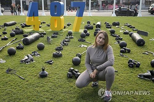 Former Ukraine wrestler Oksana Rakhra poses in front of a UK government arranged display at Parliament Square in London, Wednesday, July 24, 2024. The UK Government is honouring Ukrainian athletes whose lives have been lost due to Russia's full-scale invasion with a display of sport equipment. The conflict has already claimed the lives of at least 487 Ukrainian athletes.(AP Photo/Frank Augstein)