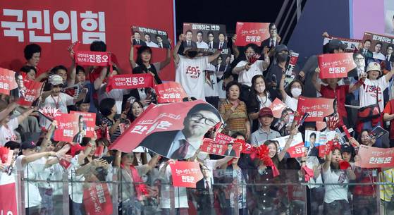 지난 23일 국민의힘 전당대회가 열린 경기 고양 킨텍스 앞에는 행사 시작 4시간 전부터 한동훈 대표 지지자 100여 명이 운집했다. 이들은 비옷을 입은 채 행사장 앞에서 ‘변화의 시작 한동훈’이라고 적힌 응원 도구를 흔들더니, 오후 5시 개표 결과 발표가 임박하자 행사장 입구 앞에 나란히 줄 지어 섰다. 빨간색 멜빵바지를 입은 현장 리더 격인 여성 회원 최모(53)씨 안내에 맞춰 착착 움직였다. 득표율 62.8%란 압승 결과가 발표되자, 이들은 일제히 부둥켜 안고 환호성을 내질렀다.