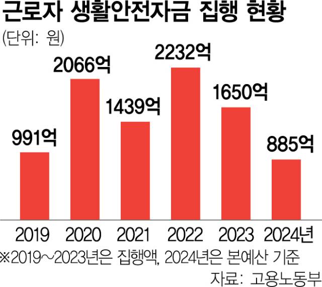 24일 기획재정부와 고용노동부에 따르면 올해 상반기까지 집행된 생활안정자금 융자는 총 876억 원으로 집계됐다. 올해 전체 예산인 885억 원의 99.0%에 달하는 규모로, 영업일 기준 올 상반기에만 매일 7억 원씩 예산이 나간 셈이다. 생활안정자금은 결혼이나 장례·질병 등 예기치 못한 사유가 발생했을 때 취약 근로 계층에 연 1.5%의 금리로 최대 2000만 원을 빌려주는 사업이다.
