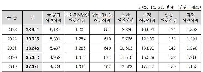 25일 보건복지부의 '2023년 12월말 기준 보육 통계'와 '2024 노인복지시설 현황'을 보면 작년 전국의 어린이집은 2만8천954곳으로 2022년 3만923곳보다 1천969곳 감소했다.