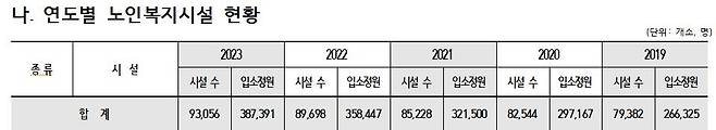노인복지관, 경로당, 양로시설, 노인복지주택, 노인요양시설, 재가노인복지시설 등 노인복지시설은 2022년 8만9천698곳에서 작년 9만3천56곳으로 1년새 3천358곳이나 증가했다.