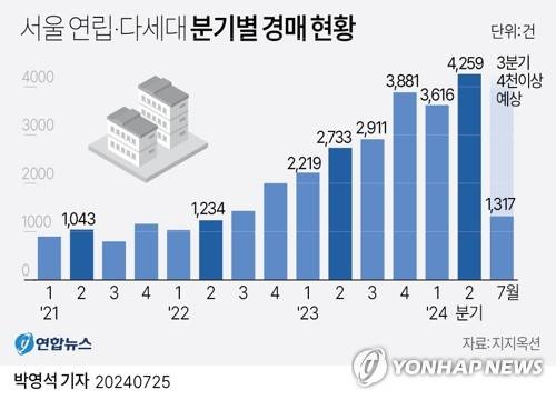 (서울=연합뉴스) 박영석 기자 = 25일 경·공매 데이터 전문기업 지지옥션에 따르면 지난 2분기 서울의 빌라 경매 진행 건수는 4천259건으로, 통계를 집계하기 시작한 2001년 이래 분기 기준 역대 최다를 기록했다.