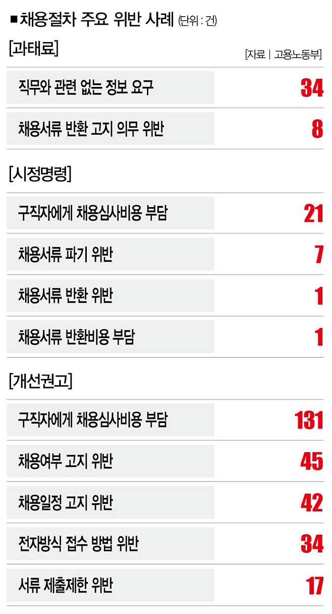 시정명령 사안은 구직자에게 채용심사비용 부담(21건), 채용탈락자들의 채용서류 파기 위반(7건), 채용서류 반환 위반(1건), 채용서류 반환비용 부담(1건) 등으로 나타났다.