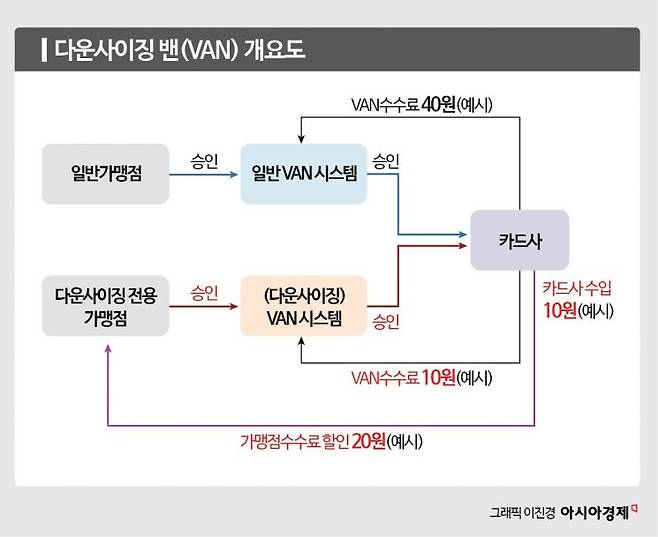 밴사는 카드사를 대행해 가맹점을 대상으로 승인중계·매입·종이전표 수거 등 결제 프로세스 관련 업무를 처리하는 업체다. 다운사이징 밴은 여기서 승인중계 핵심 기능만 따로 떼어내 구축한 서비스다. 카드사들이 다운사이징 밴을 적용하면 밴사에 지급하는 수수료를 대폭 절감할 수 있다. 예컨대 스타벅스와 같은 가맹점이 일반 밴시스템을 쓸 경우 카드사가 고객 결제 건당 밴사에 지급하는 수수료는 40원이지만 다운사이징 밴을 쓰면 10원 수준으로 낮아진다.