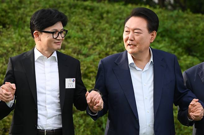 | ▲ 윤석열 대통령이 24일 서울 용산 대통령실 앞 파인그라스에서 열린 국민의힘 신임 지도부 초청 만찬에서 국민의힘 한동훈 신임 대표와 함께 하고 있다. [대통령실 제공] |