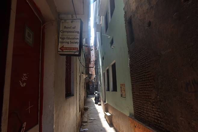| ▲ 소밋호스텔(Somit Paying Guest House) 입구로 가는 길 오랜 전통을 가진 바라나시의 거리는 좁은 골목의 향연이 펼쳐진다. 소밋이 운영하는 호스텔 간판 앞의 모습에서도 바라나시의 골목 정취가 느껴진다. |