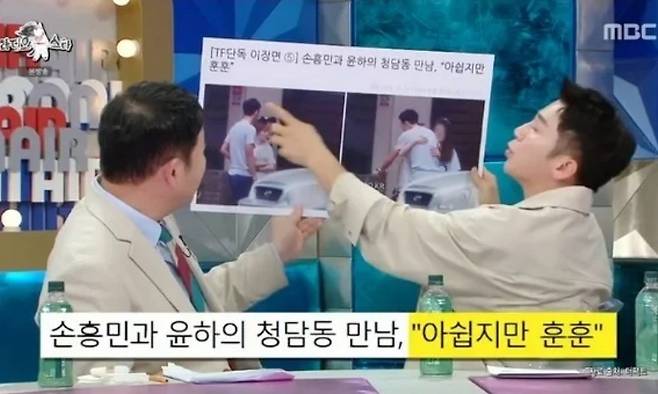 윤하는 "저도 찍힌 줄 몰랐는데 손흥민 씨와 한번 밥을 먹었다. 제가 라디오 하던 당시 출연하셨고 또래 축구선수들이 나와 친하게 지내 집에 초대해 밥도 같이 먹던 때가 있었다. 그러다 오랜만에 한국 들어와 밥을 먹자고 해서 (먹고) '잘 가. 몸 다치지 말고'라며 가벼운 포옹을 하는 게 찍힌 거다. 찍혔는데 연말 특집 기사로 나왔다. 12월 31일 나왔는데 제목이 '훈훈한 우정'이더라"고 말했다.