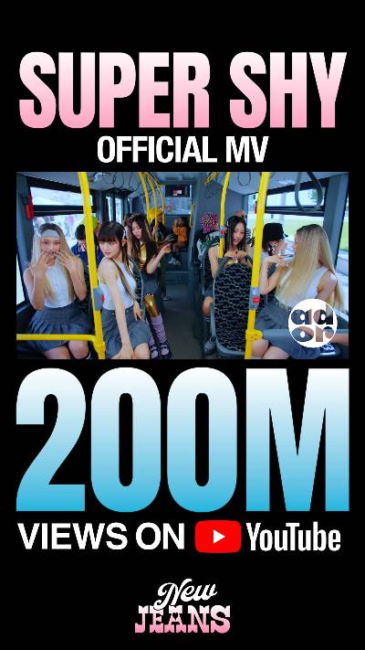 하이브의 레이블인 어도어(ADOR)에 따르면 뉴진스의 두 번째 EP '겟 업'(Get Up)의 트리플 타이틀곡 중 하나인 '슈퍼 샤이' 뮤직비디오 유튜브 조회 수가 지난 23일 오후 2억 회를 넘어섰다.