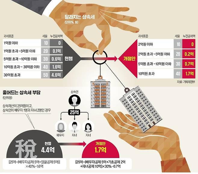 상속재산이 25억원이고 상속인이 배우자 1명, 자녀 2명일 때도 현재 기준으로는 상속세가 4억4000만원 부과되지만 개정안을 적용하면 1억7000만원으로 2억7000만원 줄어든다.