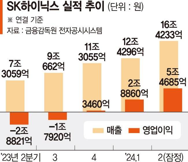 SK하이닉스는 올해 2·4분기 매출 16조4233억원, 영업이익 5조4685억원을 기록했다고 25일 밝혔다. 매출은 전년동기 대비 124.8% 증가했다. 지난 2022년 2·4분기 기록한 분기 기준 종전 최고치(13조8110억원)를 경신했다. 영업이익도 전년동기 대비 흑자로 돌아섰다. 반도체 슈퍼 호황기였던 2018년 2·4분기(5조5739억원), 2018년 3·4분기(6조4724억원) 이후 약 6년 만의 5조원대 영업이익이다.