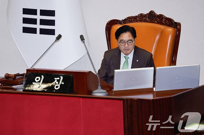 (서울=뉴스1) 안은나 기자 = 우원식 국회의장이 25일 오후 10시쯤 서울 여의도 국회에서 방통위법(방송통신위원회의 설치 및 운영에 관한 법률 일부개정법률안)에 반대하는 최형두 국민의힘 의원의 무제한 토론(필리버스터)을 듣고 있다. 2024.7.25/뉴스1