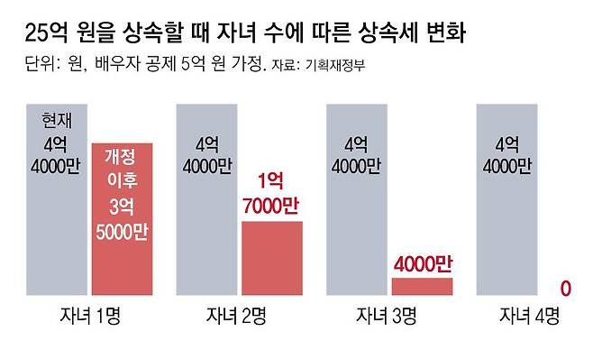 기획재정부의 추산에 따르면 25억 원의 재산 가운데 5억 원은 배우자에게, 20억 원은 자녀 2명에게 물려주는 것으로 가정했을 때 현재는 배우자 공제 5억 원과 일괄 공제 5억 원을 제외한 15억 원에 대해 상속세가 부과된다. 자녀 공제가 1인당 5000만 원에 불과하기 때문에 자녀 수에 따른 공제는 큰 의미가 없기 때문이다.
