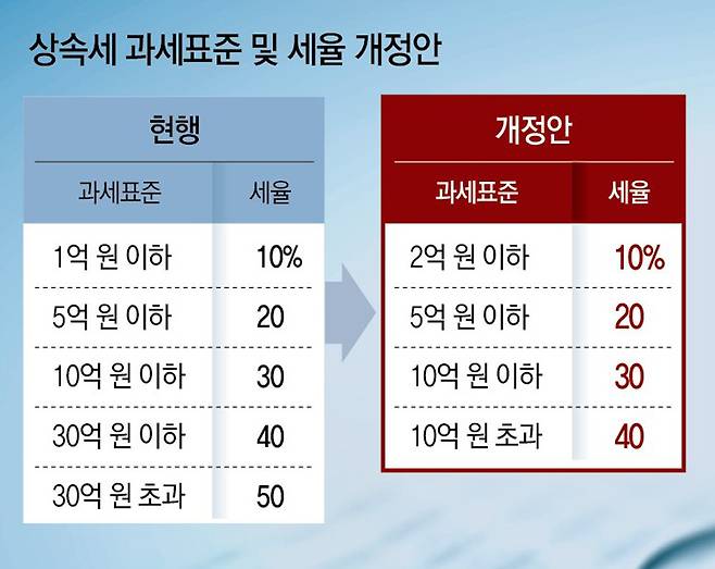 내년부터 자녀에게 물려주는 재산에 상속세를 매길 때 자녀 한 명당 공제해주는 금액이 10배로 늘어난다. 최고세율도 50%에서 40%로 낮춘다. 최고세율 조정은 25년 만에, 상속세 공제 한도는 9년 만의 개편이다. 하지만 더불어민주당이 “부자 감세는 안 된다”며 반발하고 나서 국회 통과에는 난항이 예상된다.