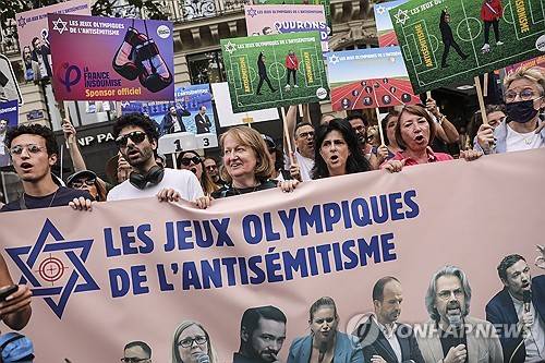 epa11496368 Pro-Israeli demonstrators with a banner calling the Paris 2024 Olympics 'the games of anti-Semitism,' rally on the sidelines of a counter-opening ceremony against the Paris 2024 Olympic Games organized by humanitarian associations in Paris, France, 25 July 2024. Humanitarian organizations such as Le reverse de la medaille, Droit au Logement, Medecins du Monde, and trade union Solidaires, denounced the eviction of mostly migrants from camps located near Olympic venues ahead of the Paris 2024 Olympic Games as 'social cleansing' and a 'manhunt.' The Paris 2024 Olympic Games will take place from 26 July to 11 August 2024. EPA/TERESA SUAREZ