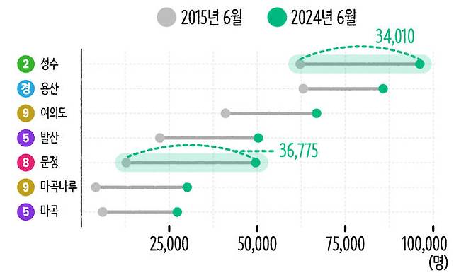 ✏️ 2015년 1월 성수역 평일 평균 이용객은 6만 1,261명이었는데, 2024년 6월엔 그 규모가 9만 6,207명으로 늘어납니다.
