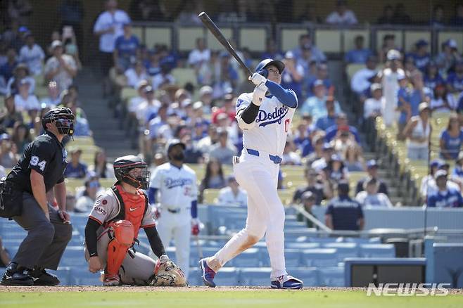 [로스앤젤레스=AP/뉴시스] LA 다저스의 지명 타자 오타니 쇼헤이가 25일(현지시각) 미 캘리포니아주 로스앤젤레스의 다저스타디움에서 열린 2024 메이저리그(MLB) 샌프란시스코 자이언츠와의 경기 8회 말 1점 홈런(시즌 31호)을 치고 있다. 오타니는 4타수 2안타(1홈런) 1타점 1득점 1볼넷으로 활약하며 팀의 6-4 승리를 이끌었다. 2024.07.26.