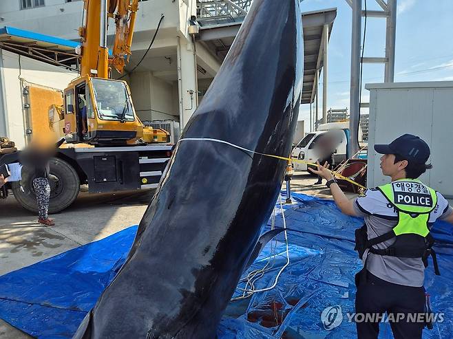 (삼척=연합뉴스) 26일 오전 7시 30분께 강원 삼척시 삼척항 동방 7마일 해상에서 밍크고래 1마리가 혼획됐다. 2024.7.26