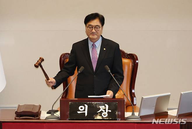 [서울=뉴시스] 고승민 기자 = 우원식 국회 의장이 26일 서울 여의도 국회에서 열린 제416회 국회(임시회) 제1차 본회의에서 방송통신위원회의 설치 및 운영에 관한 법률 일부개정법률안을 가결(재석 183인, 찬성 183인) 시키고 있다. 2024.07.26. kkssmm99@newsis.com